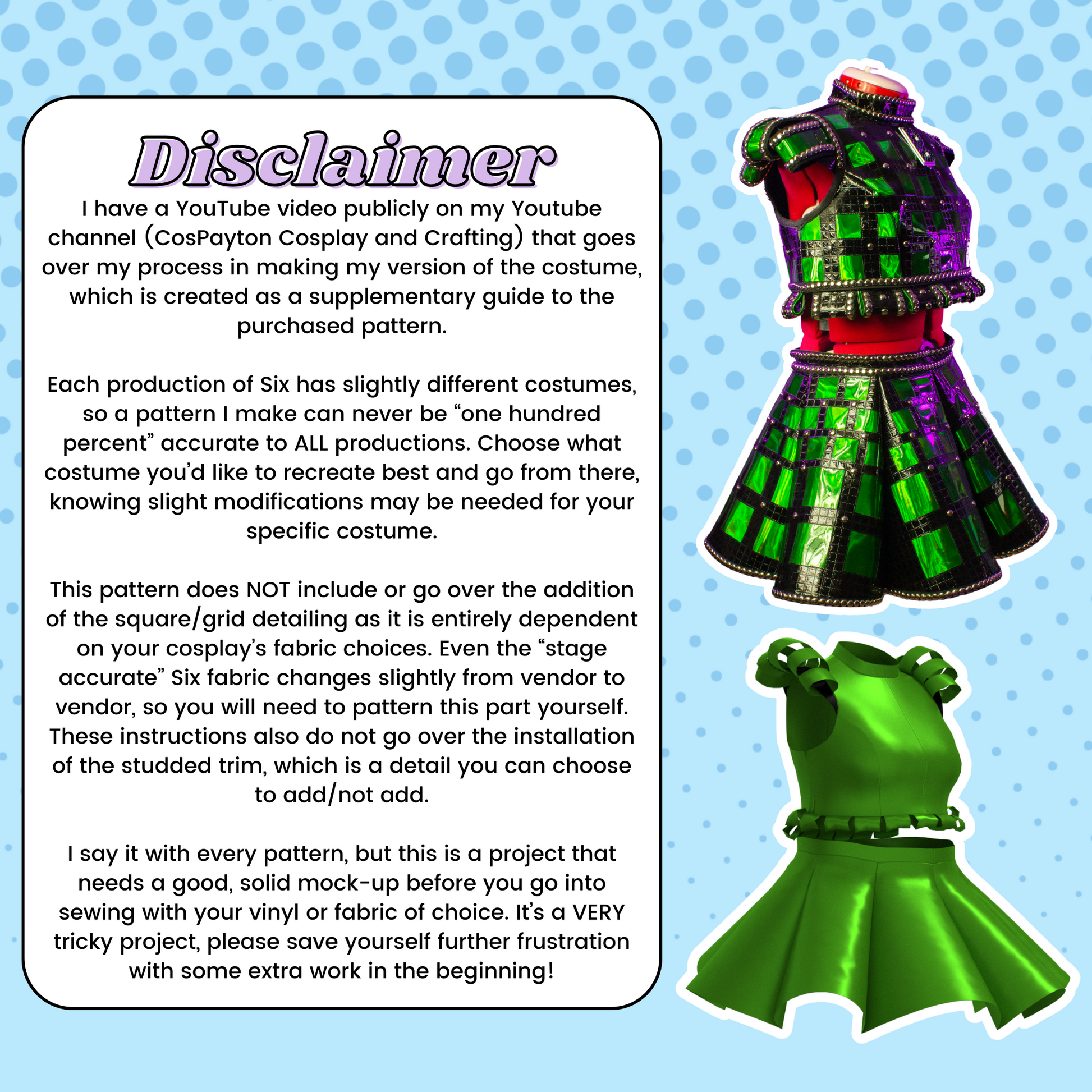 Each production of Six has slightly different costumes, so a pattern I make can never be “one hundred percent” accurate to ALL productions. Choose what costume you’d like to recreate best and go from there, knowing slight modifications may be needed for your specific costume.