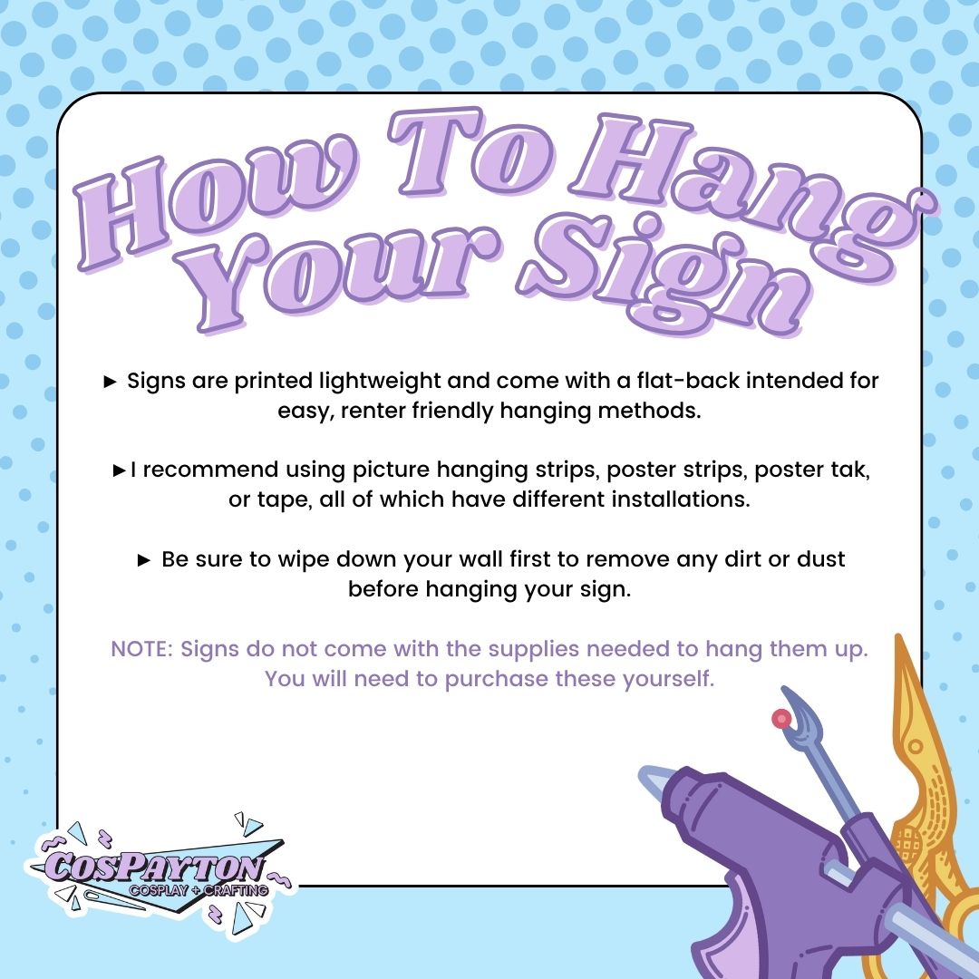 NOTE: Signs do not come with the supplies needed to hang them up. You will need to purchase these yourself.