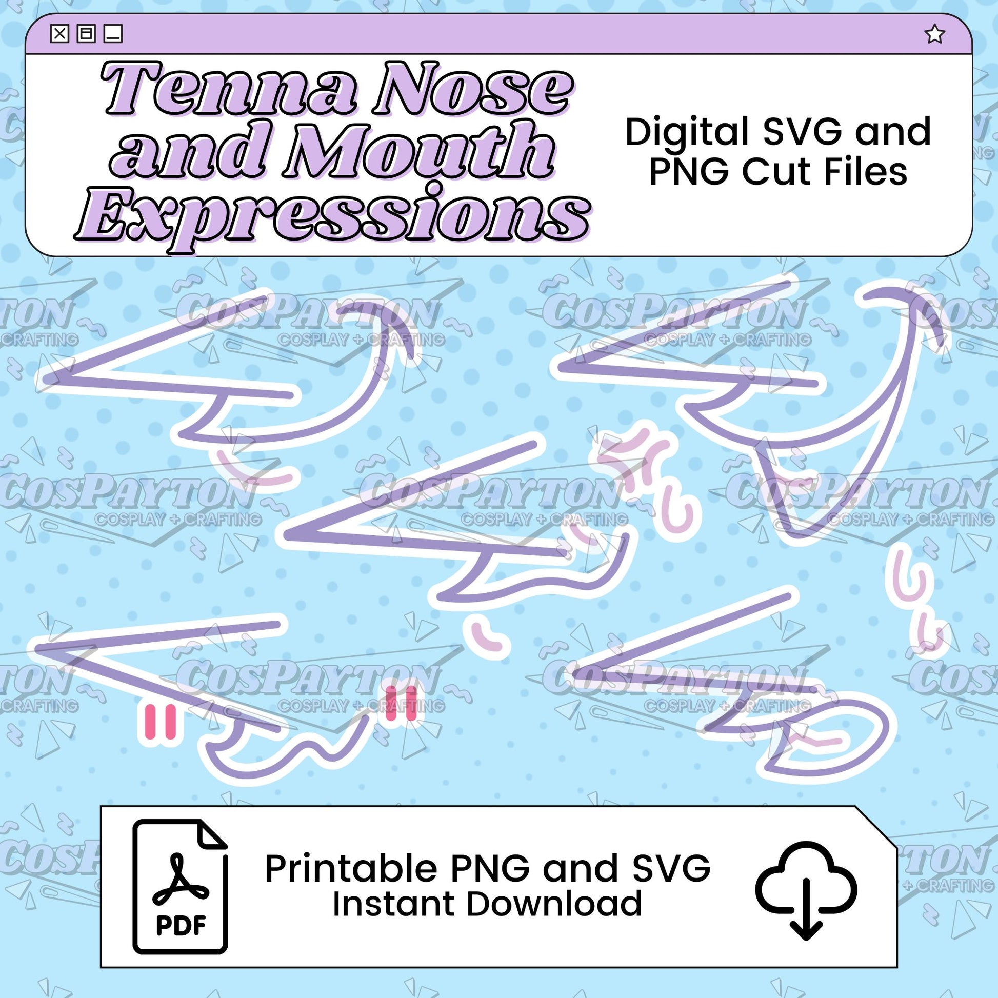 Your purchase includes printable digital templates for Tenna Nose and Mouth Expressions, inspired by Deltarune. Templates are intended to help with cosplay projects, but can also be used for various crafting projects such as sticker making, embroidery, art references, and more!
